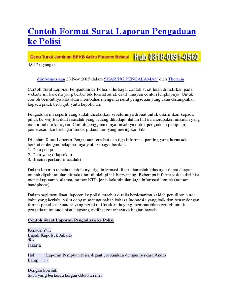 Contoh surat laporan pengaduan ke polisi pdf kumpulan contoh laporan. Tenang, di sini ada contoh surat pengaduan ke polisi. Surat pengaduan polisi berisi laporan mengenai tindak pidana yang nyata terjadi dan disaksikan langsung oleh pihak pelapor. Contoh surat laporan pengaduan ke polisi.